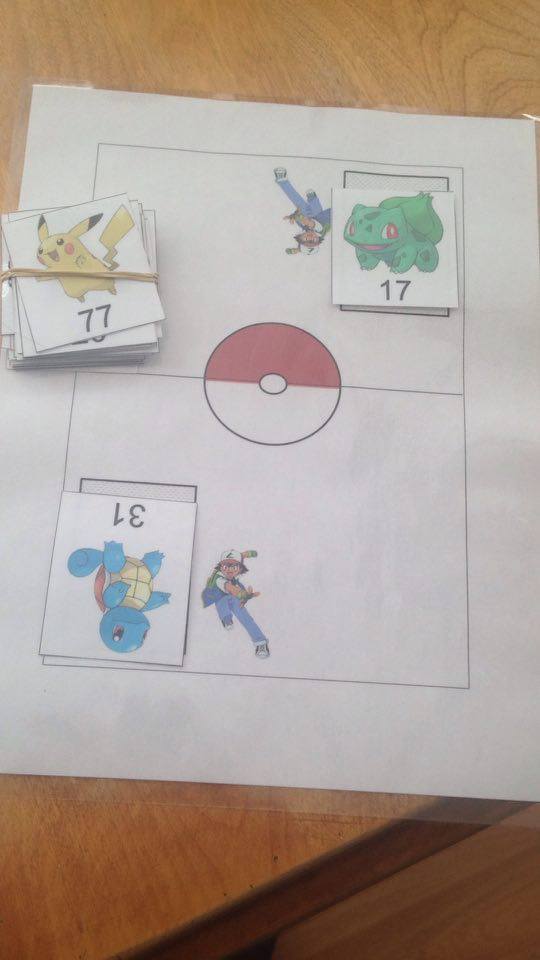 J’ai donc décidé de créer deux jeux différents avec un sujet que les élèves adoraient : les Pokémon ! Dans un premier temps, j’ai créé un jeu de bataille Pokémon pour les élèves de première année. C’est simple : un aréna Pokémon, des cartes avec des Pokémon populaires et, surtout, des nombres. Le jeu oppose deux joueurs en duel. Chaque joueur possède 18 cartes qui sont retournées face contre le sol afin de ne pas voir les nombres qui se trouvent sur celles-ci. Au signal, les deux joueurs retournent une carte. Le joueur ayant le nombre le plus élevé remporte le duel et ramasse la carte de l’autre joueur. Par contre, les élèves doivent nommer les nombres qui se trouvent sur chacune de leur carte. Le gagnant est celui qui a le plus de cartes amassées à la fin des 18 duels. Il existe un premier paquet de cartes avec les nombres de 0 à 99. Les élèves qui maîtrisaient ces nombres pouvaient par la suite jouer avec l’expansion qui contenait les nombres de 100 à 199.