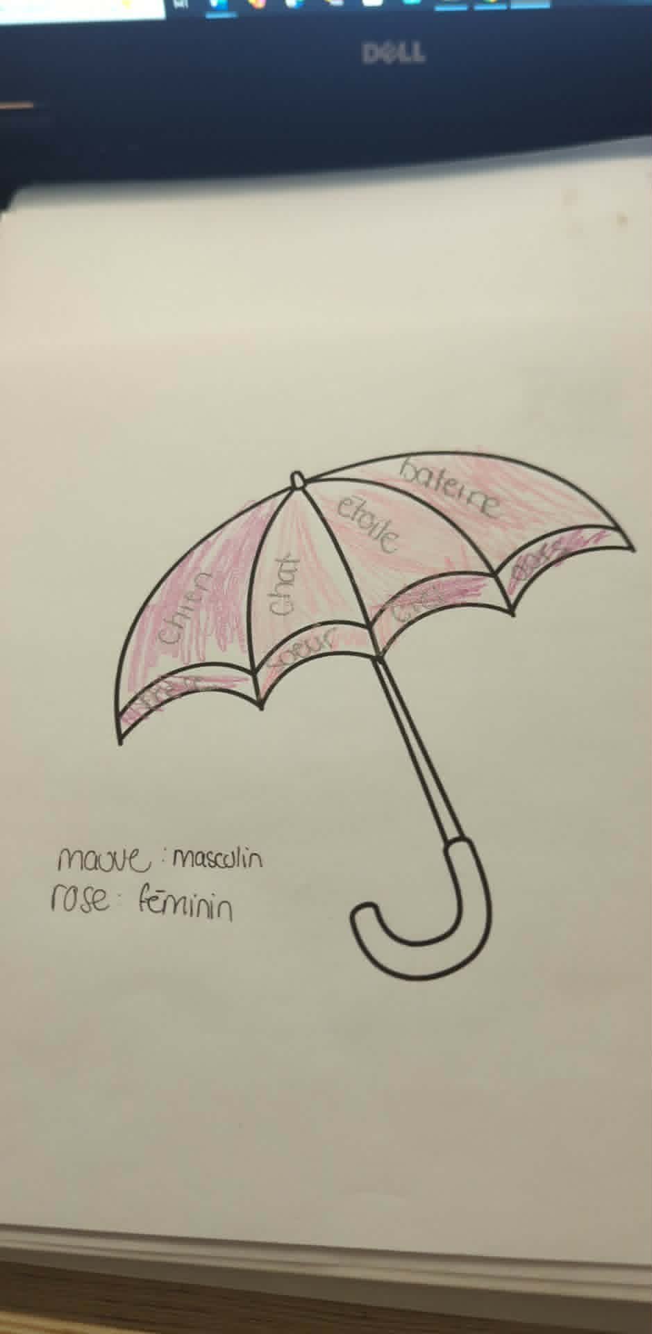 Activité 2: avec l'accompagnement de l'adulte, l'élève doit classer des mots étiquettes dans les bons pots selon le genre. Ensuite, seule, elle doit choisir deux crayons de couleur (un pour le masculin et un pour le féminin). Sur un dessin de parapluie sont inscrits des noms masculins et féminins. L'élève doit colorier la bonne couleur selon le genre.