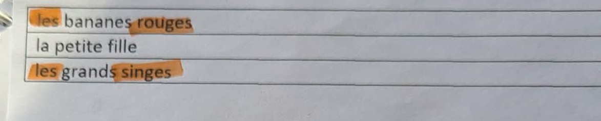 L'élève semblait apprécier davantage les activités qu'elle faisait de façon autonome, car elles demandaient davantage de manipulation. Elle est parvenue à identifier les noms et les déterminants. Elle a également eu de la facilité à colorier les noms masculins et féminins. Je remarque qu'elle avait plus de difficulté à identifier les marques de pluriel dans les noms et les déterminants. Elle semblait davantage le faire au hasard. Par contre, lorsqu'elle devait classer les mots dans les potagers des noms au pluriel ou au singulier, elle parvenait à le faire sans mon aide.