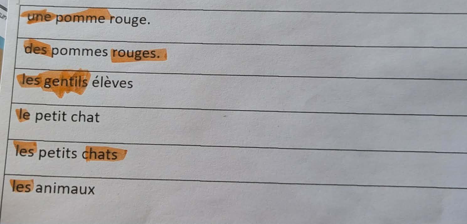 Activité 3: avec l'accompagnement de l'adulte, l'élève doit identifier les marques de pluriel des déterminants et des noms sur une feuille de papier et avec un surligneur. Ensuite, seule, elle doit classer les mots étiquettes de noms accompagnés de leurs déterminants dans le bon "potager". Potager des mots au pluriel ou potager des mots au singulier.
