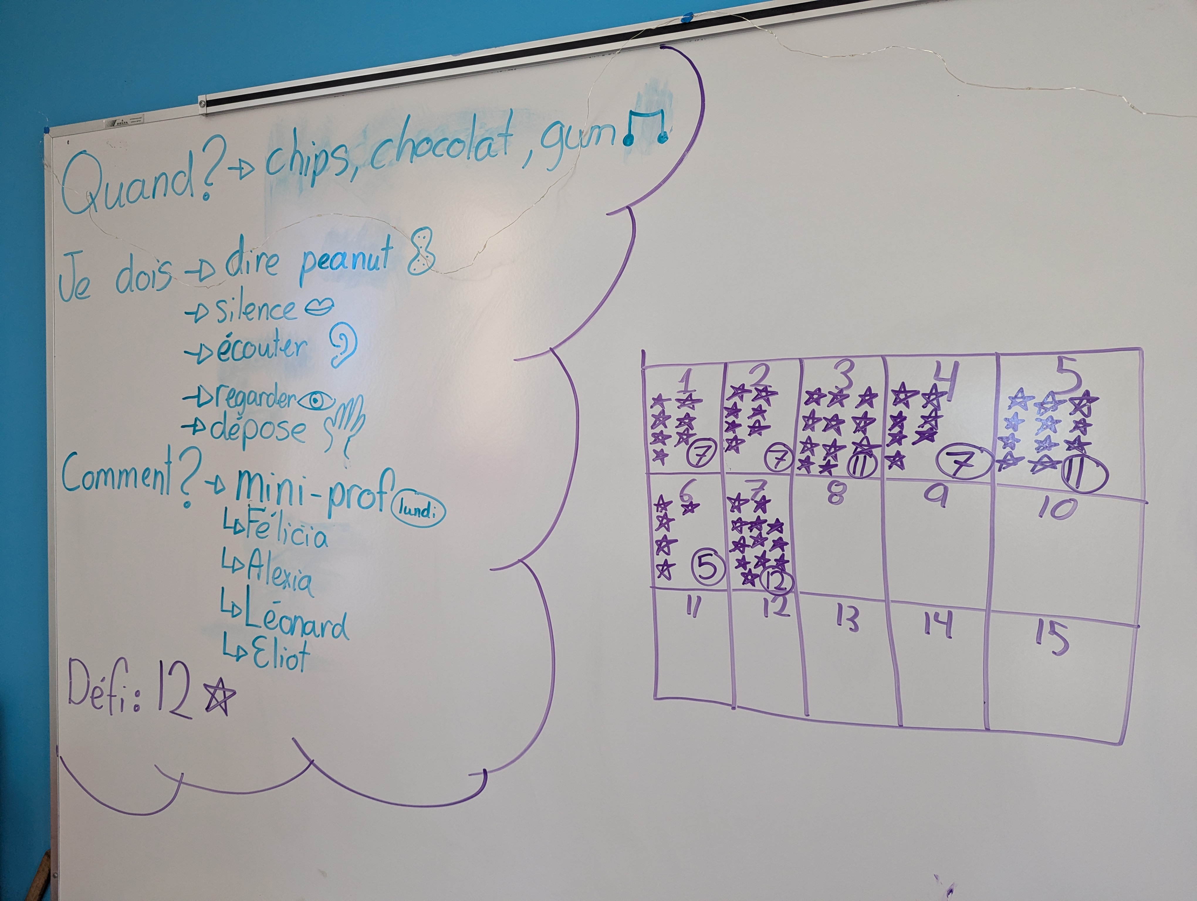 Nous comptabilisions les transitions réussies à l’aide d’étoiles, permettant aux élèves de visualiser leurs progrès de jour en jour. Cela me permettait aussi de montrer aux élèves que nous avions plus de temps pour des activités qu’ils aimaient lorsque nous avions plus d’étoiles (c'est-à-dire qu'on gagne du temps lorsque les transitions sont efficaces). Ainsi, le projet était plus concret aux yeux des élèves.