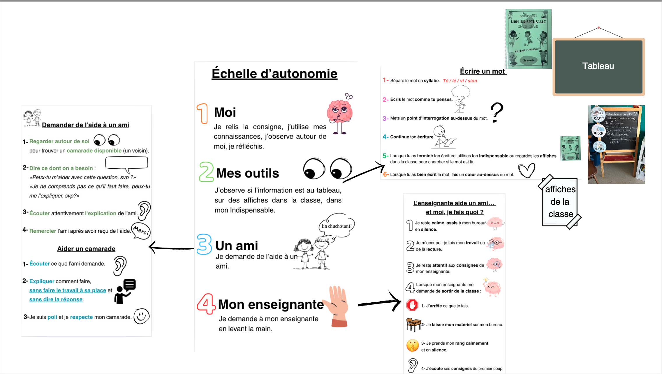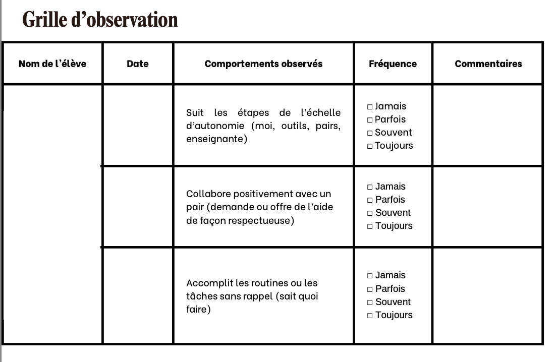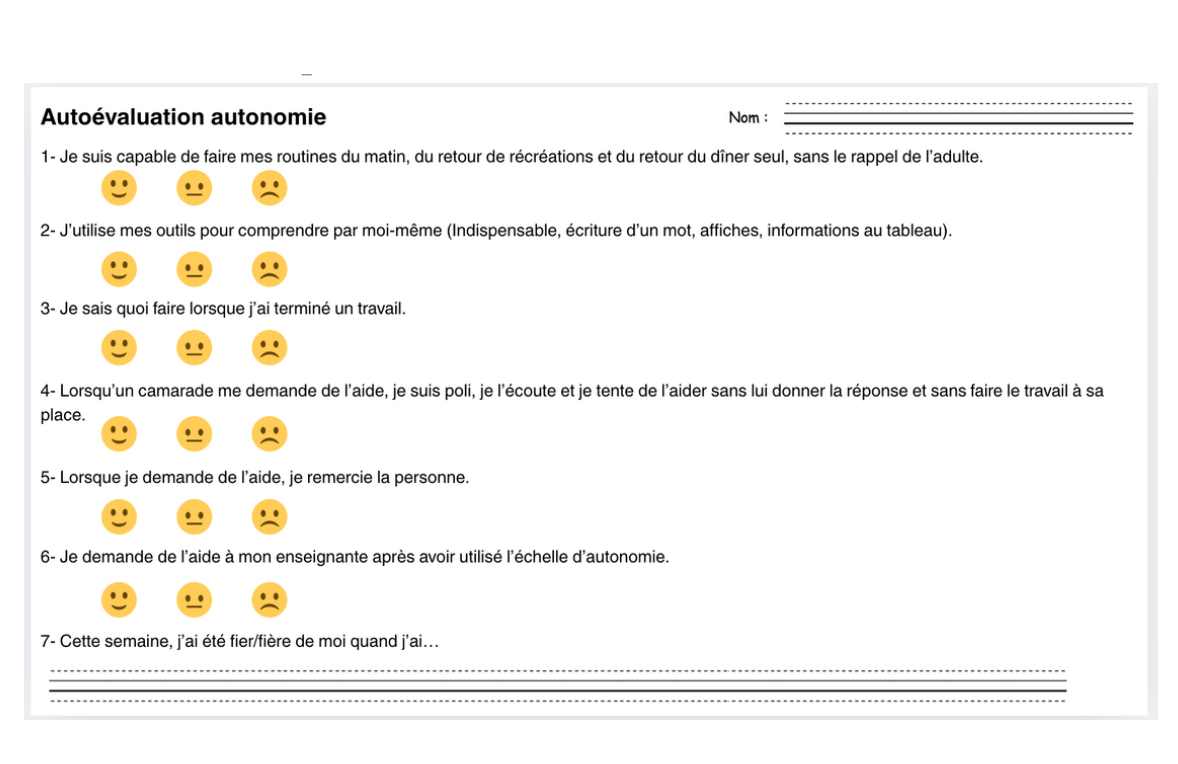 J’ai également valorisé davantage les repères visuels et le plan de travail déjà en place. Des stratégies ont été enseignées explicitement afin d’apprendre aux élèves à formuler une demande d’aide appropriée, à offrir une aide adéquate à un camarade et à savoir quand et comment demander l’aide de l’enseignante, notamment lorsque celle-ci était occupée. Finalement, une autoévaluation hebdomadaire de l’autonomie ainsi qu’une grille d’observation ont été utilisées afin de soutenir le développement de la métacognition et de rendre visible la progression des élèves.