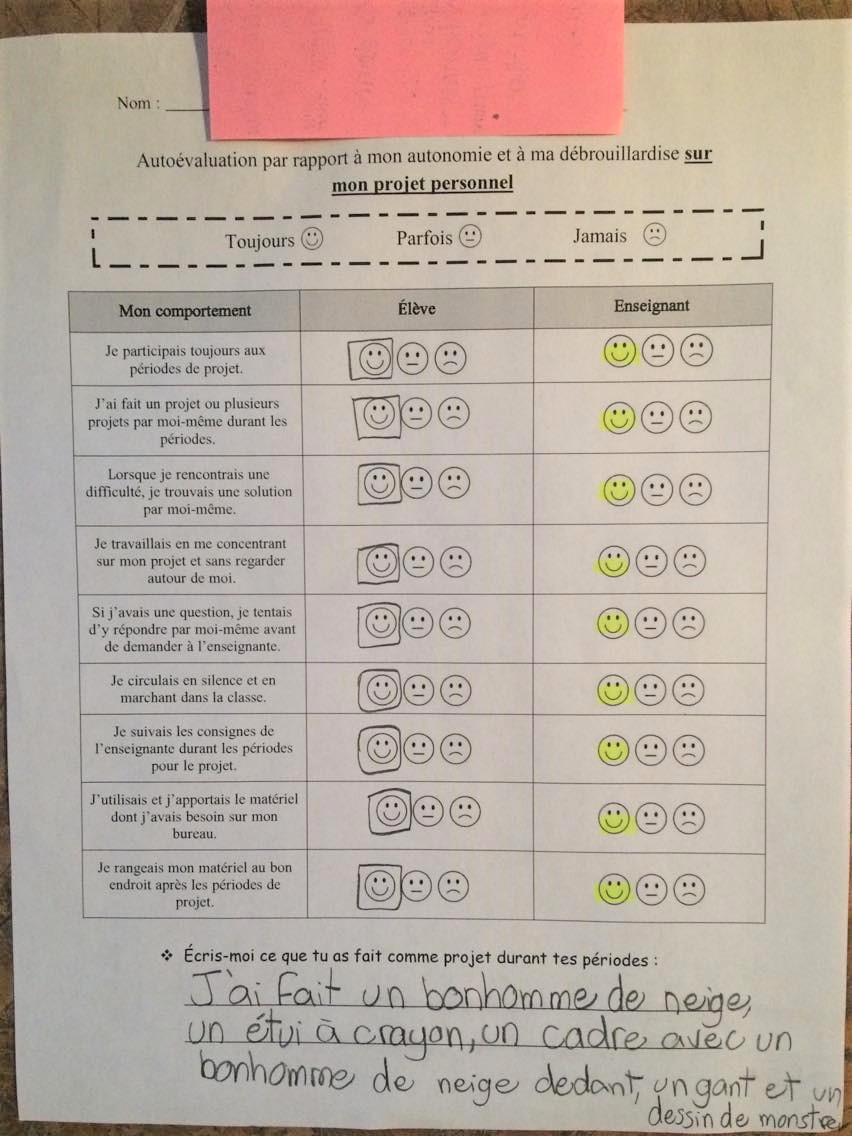 J'ai fait des évaluations formatives, car ce projet mettait de l’avant le développement personnel des élèves. C’est pourquoi, je désirais garder des traces concrètes à l'aide de différents tableaux réalisés avec Word. Ceux-ci me permettaient d'évaluer l’autonomie et la débrouillardise des élèves avant le PIC et à la fin de ce dernier. De plus, les tableaux me permettait de comparer les différents résultats et d’en voir les répercussions.