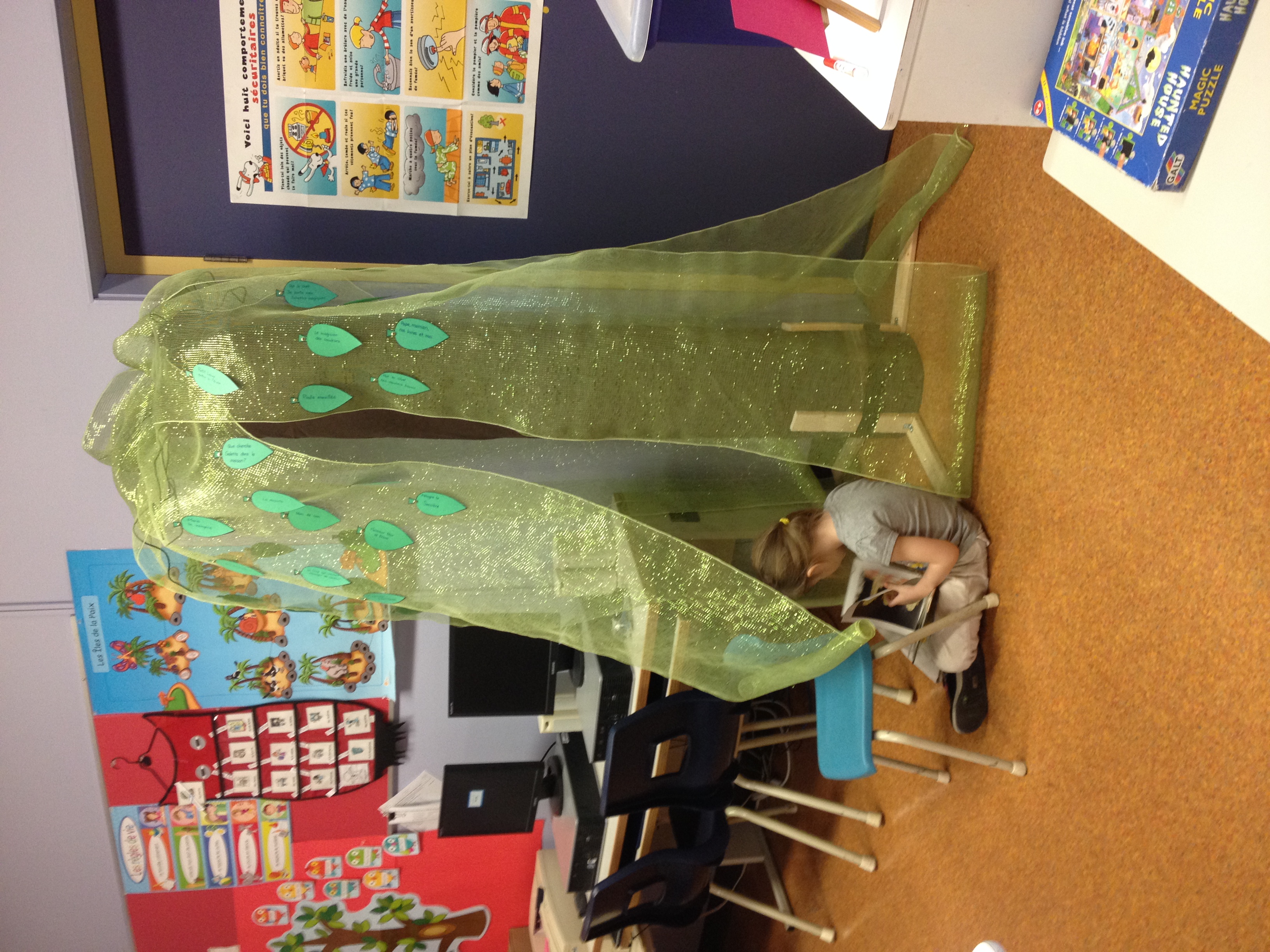 J’ai donc construit un saule pleureur d’environ 2 mètres de haut. J’ai utilisé un tube de coffrage en carton pour le tronc de l’arbre et du tulle vert pour faire les branches de feuilles. De plus, j’ai utilisé d’anciens coussins que mon enseignante associée n’utilisait plus parce qu’ils étaient désuets. J’ai changé le couvre-coussin avec un beau tissu vert pour qu’ils soient en harmonie avec l’arbre. Je les ai mis au bas de l’arbre afin que les élèves puissent s’asseoir dessus.