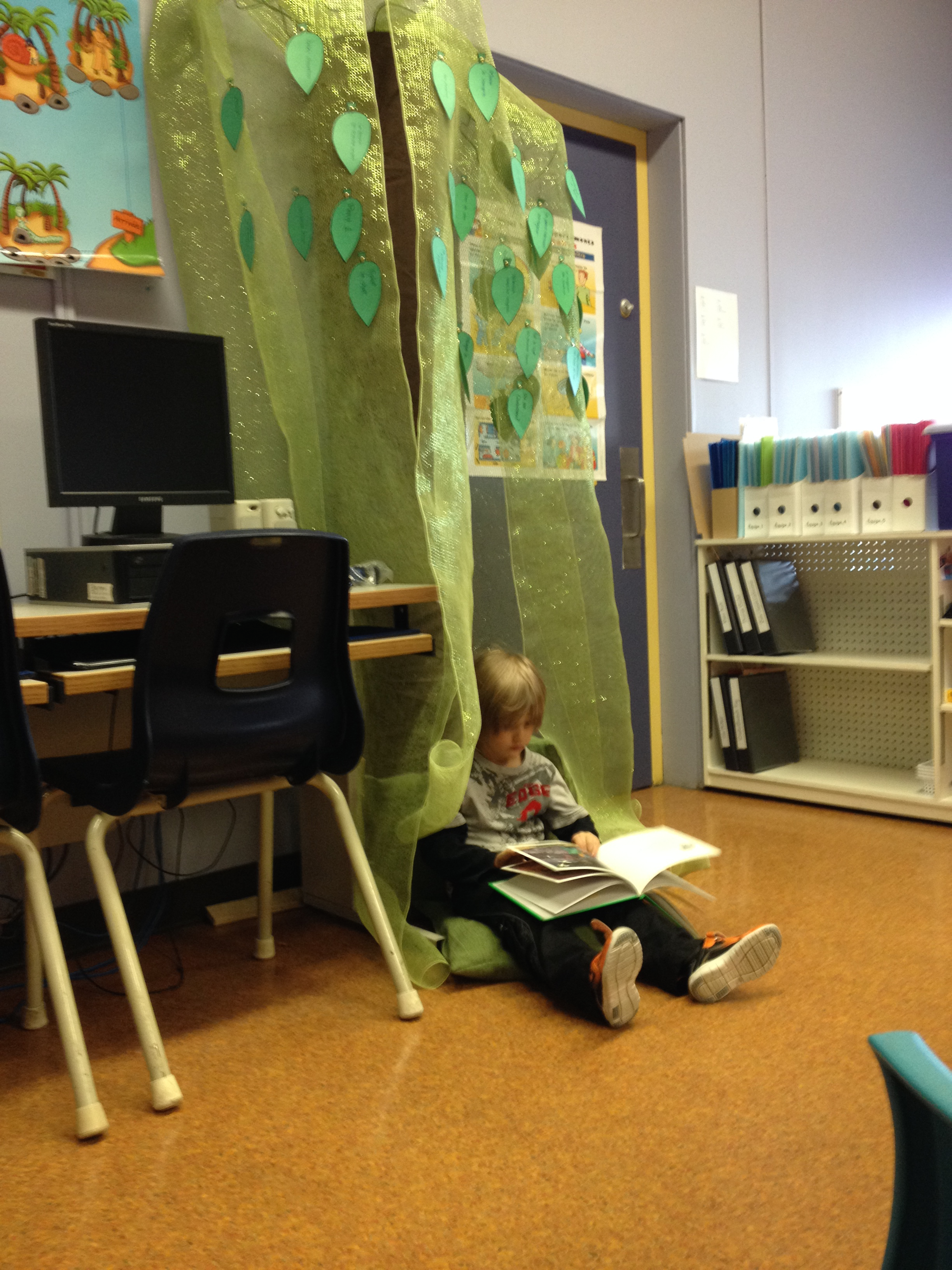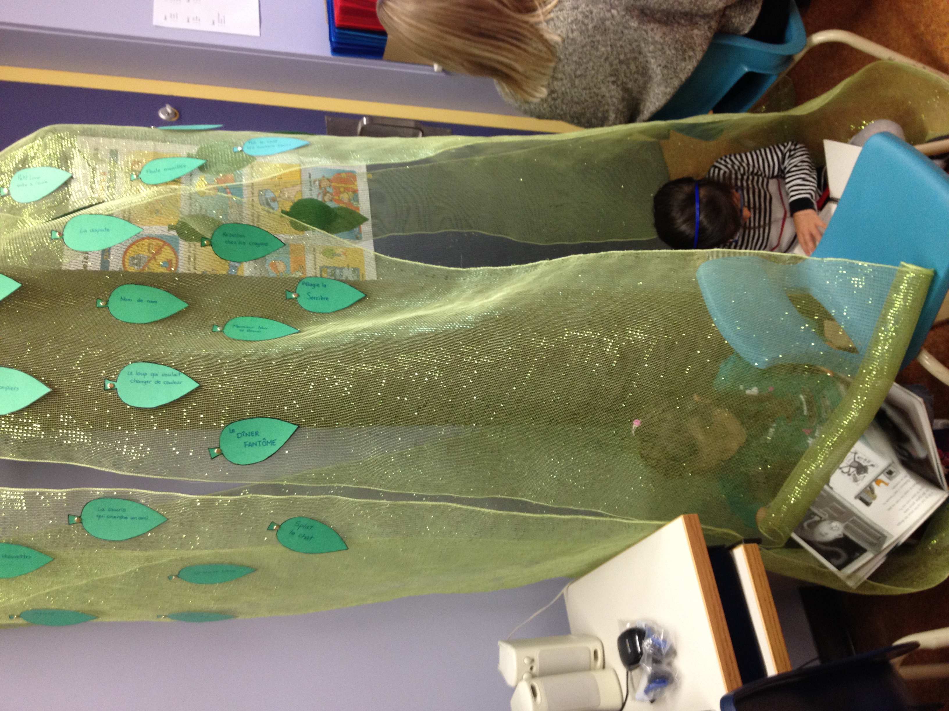 Au courant de mon projet, j’ai pu observer qu’il y avait plus d’inscription au coin lecture qu’au début de l’année. Lorsqu’il y avait des moments de lecture individuels, comme la lecture à soi ou prendre un livre à la fin d’une activité par exemple, j’avais beaucoup de demandes de la part de mes élèves pour qu’ils puissent s’installer en dessous de l’arbre. Cependant, c’était deux élèves maximum en dessous de l’arbre. L’arbre devenait parfois un privilège pour l’élève du jour à ces moments-là, mais il était accessible à tout le monde pendant les jeux libres.