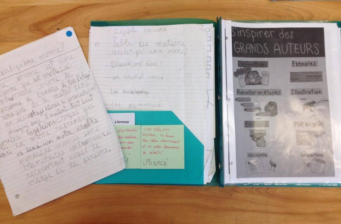Les élèves écrivent beaucoup et pour la majorité, ils semblent apprécier l’exercice. Toutefois, j’ai remarqué que la motivation des élèves n’était pas toujours au rendez-vous lors de cette tâche. Chaque élève a un dossier d’écriture afin d’y consigner toutes leurs productions ainsi que les outils qui leur sont présentés. Cependant, ils n’ont pas beaucoup l’occasion de partager leurs écrits. Plusieurs m’ont mentionné qu’ils aimeraient lire leurs textes à d’autres et les montrer à leurs parents. Certains même ne voient pas l’intérêt d’écrire et de produire de bonnes histoires puisqu’elles ne sont lues que par les enseignantes et à l’occasion par quelques élèves de la classe.
