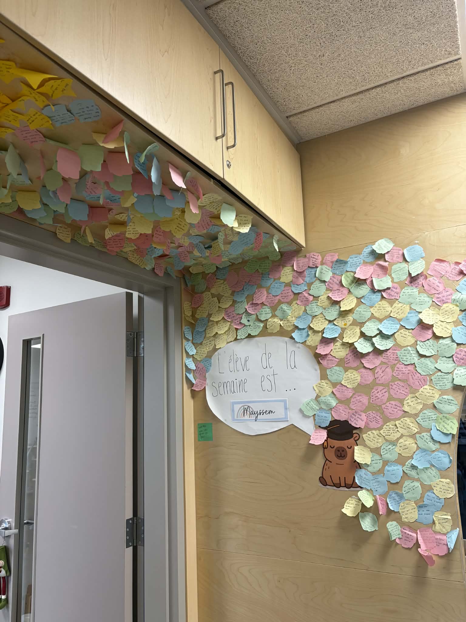 À partir de cette base, j’ai créé un système de post-it. Lorsque j’observais un comportement en lien avec le rôle d’élève, je soulignais sur un post-it le comportement de l’élève. Puis, je le lisais et l’expliquais devant la classe, favorisant la rétroaction positive et la valorisation collective. Par la suite, l’élève ayant reçu le post-it allait le coller à l’entrée de la classe. Le vendredi, les élèves participaient à la nomination et à l’élection de l’élève de la semaine, selon un processus démocratique qu’ils ont eux-mêmes créé. Le nom de l’élève de la semaine était alors affiché sur notre mur de post-it.