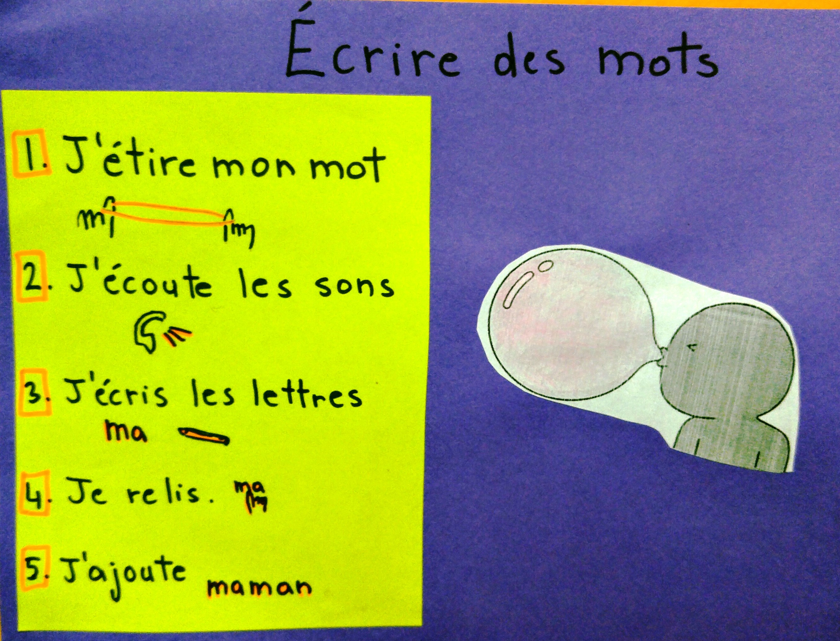 Dès les premiers jours d'école, certains élèves de première année se montraient hésitants et peu confiants lorsque venait le temps d'écrire un mot (comment l'écrire ?) ou à propos d'un sujet (quoi écrire ?). Dans le contexte du niveau de première année où l'enseignement de la lecture et de la calligraphie occupent une grande place, l'enseignement explicite de l'écriture est intéressant afin d'outiller les élèves et leur permettre d'acquérir confiance et fierté en tant qu'auteurs.
