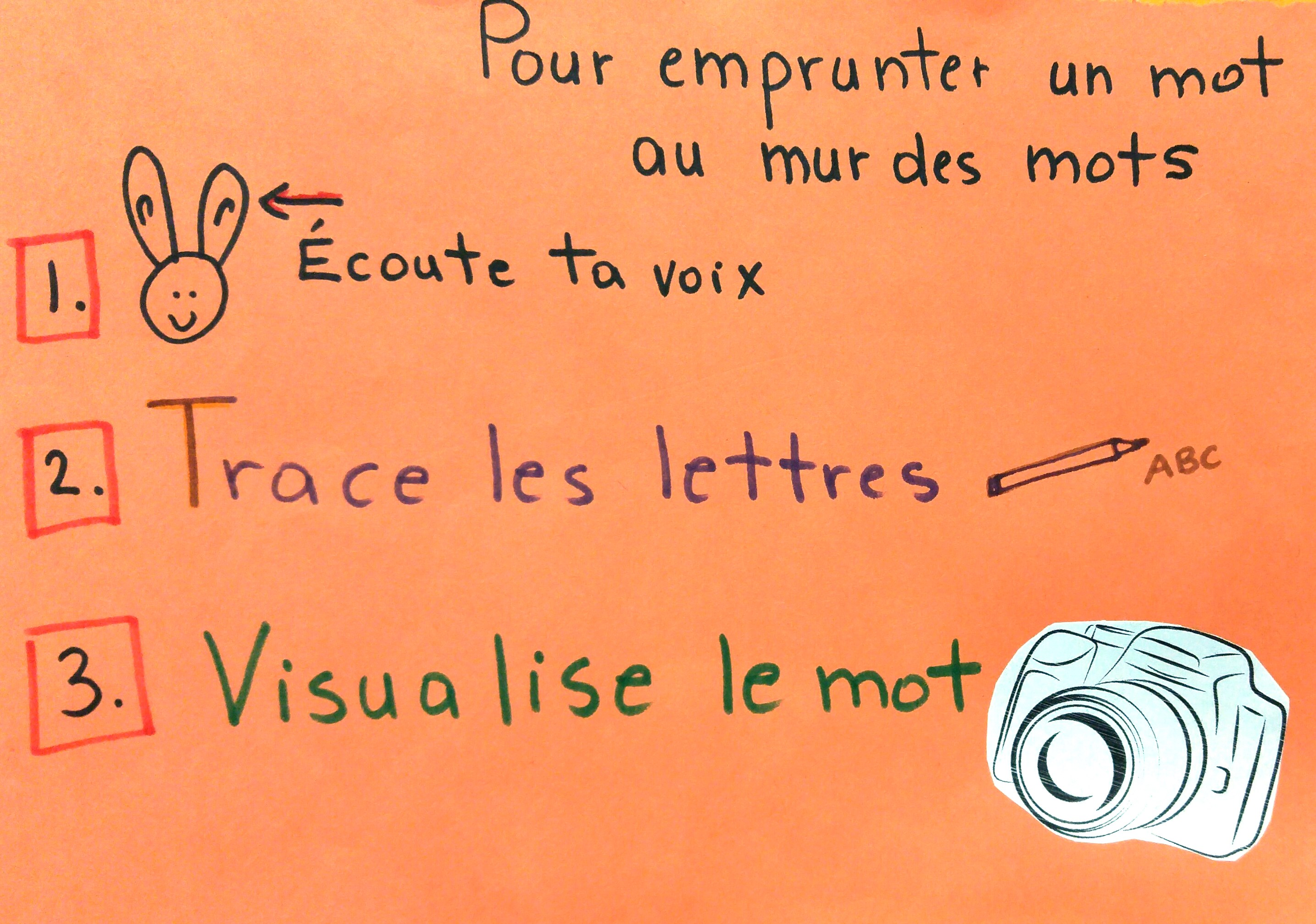 Recueil des stratégies des élèves s'ils veulent emprunter un mot du mur de mots de la classe. Enseignement explicite et tableau d'ancrage. Pratique guidée et pratique autonome.