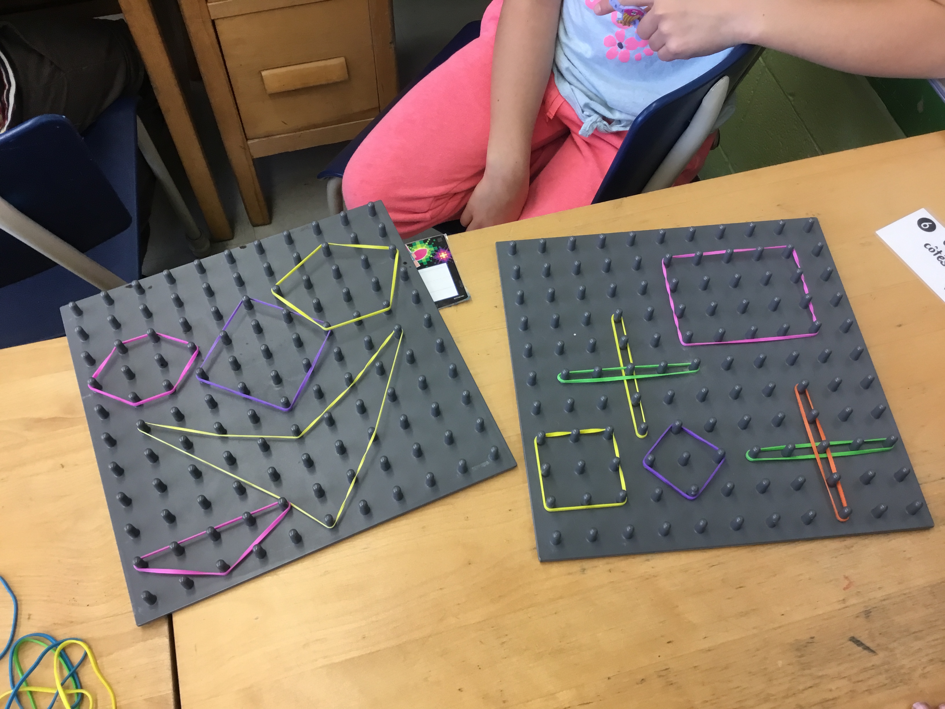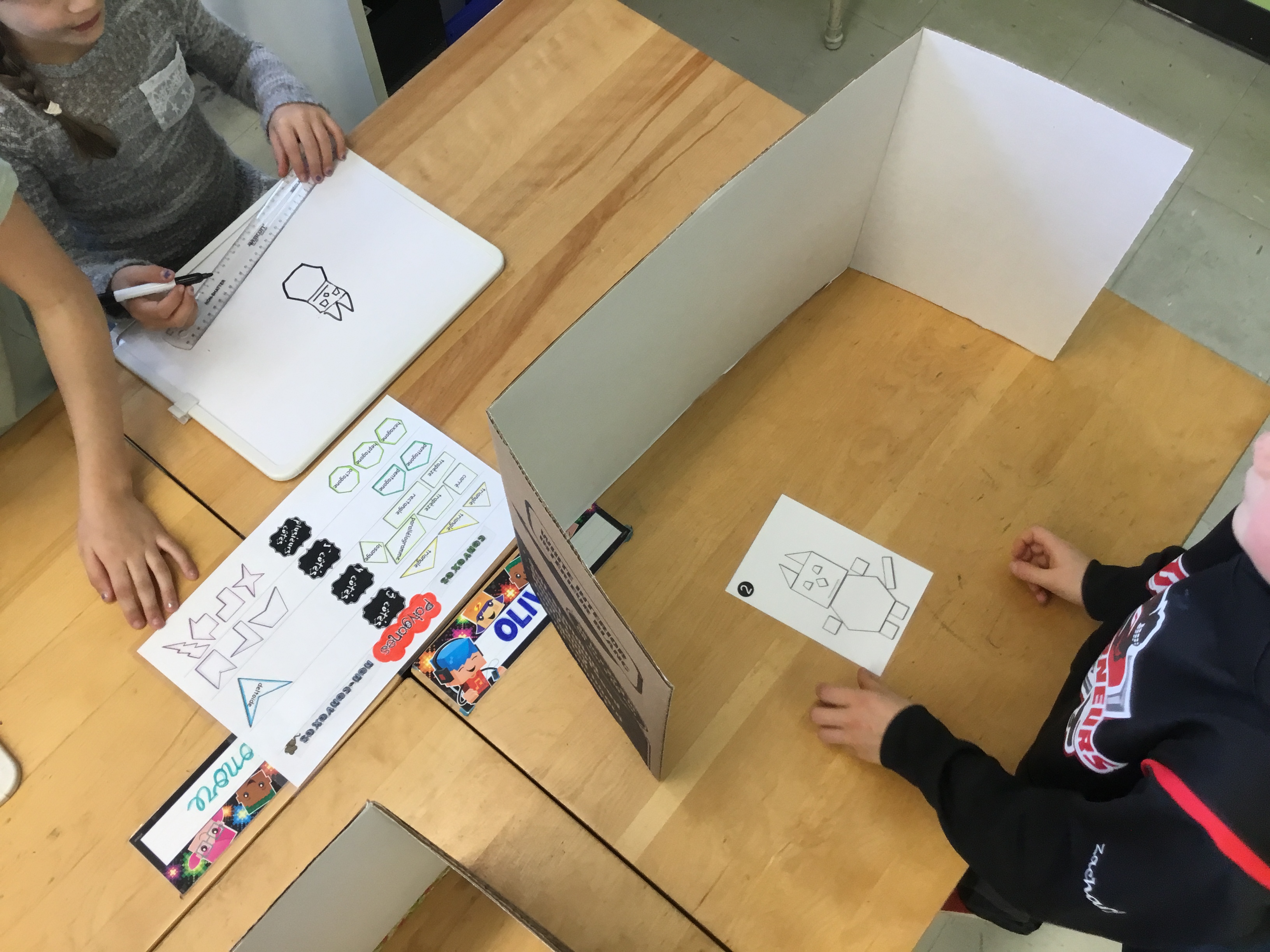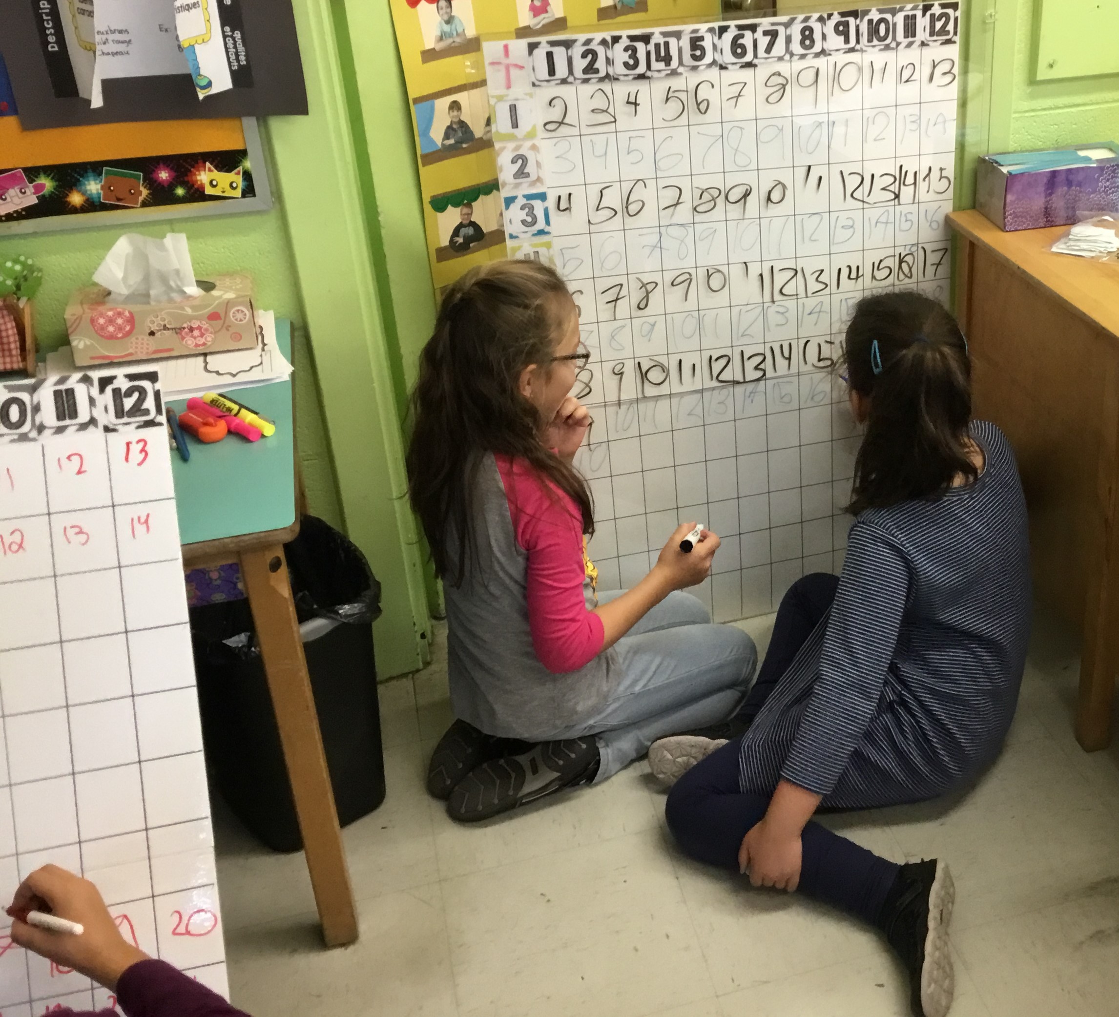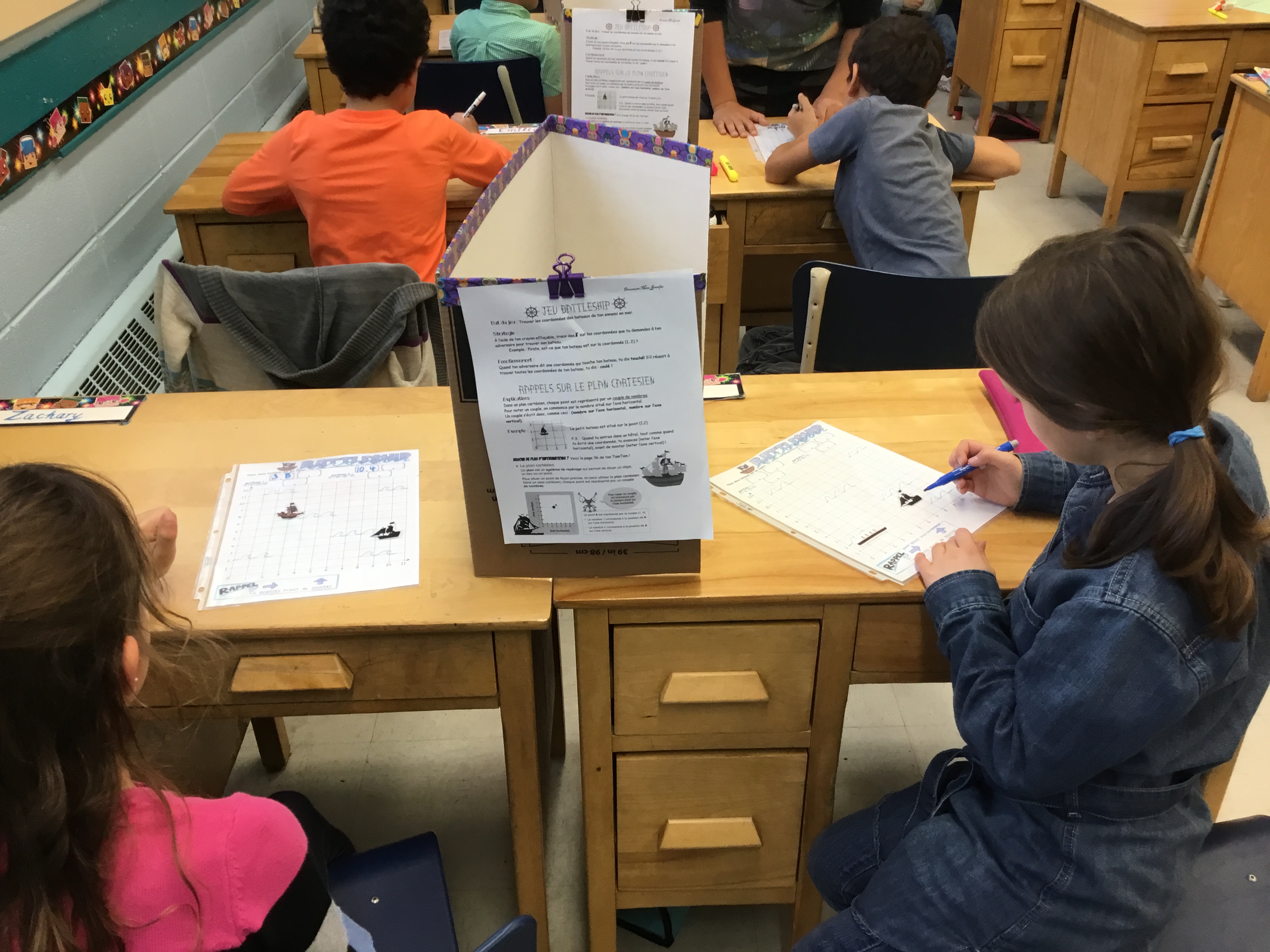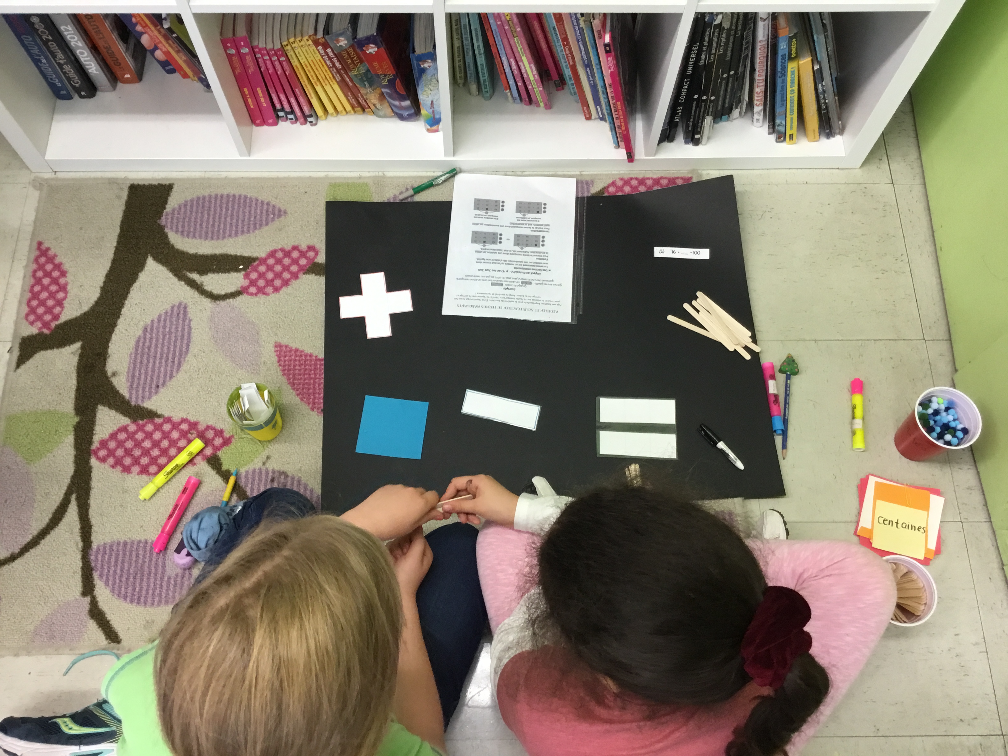 Les ateliers de mathématiques ont eu lieu à deux reprises. Ils s’étendaient sur une période de 1h et comportaient cinq stations. Dix minutes étaient attribuées à chaque station où une notion était ciblée. Les élèves étaient placés en équipe de 4 ou 6 et se plaçaient en dyade à l’intérieur-même de leur équipe pour réaliser certains ateliers où c’était nécessaire. Ils étaient mis en action avec du matériel particulier et diverses mises en situation les touchant. Chaque station avait un mentor : un élève de 5ème année qui venait animer l’activité et corriger les élèves sur place ainsi que les éclairer sur certaines notions ou stratégies qu’ils utilisaient. Les élèves mentor ont adoré leur expérience et ce fut une belle collaboration entre les deux classes.