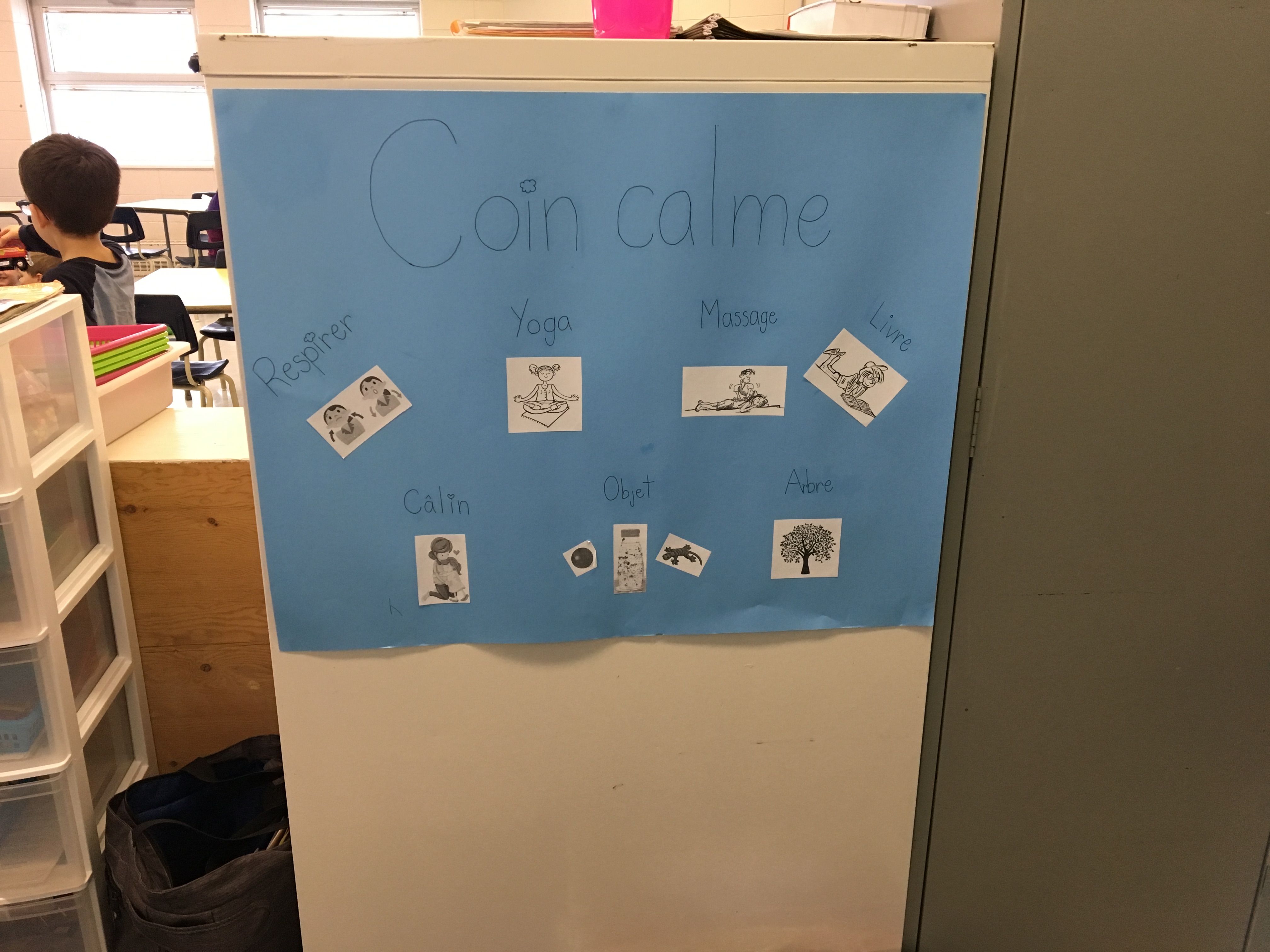 Explications des différentes façons de revenir au calme suite à une émotion forte. Présentation du coin calme (affiche et coffre à outils). Les élèves ont pratiqué différentes techniques de retour au calme ( respiration, position de yoga, massage de main, etc.). Ils ont également pu manipuler chaque outil présent dans le coffre au trésor afin de voir ce qu'il pouvait faire et la manière de l'utiliser.