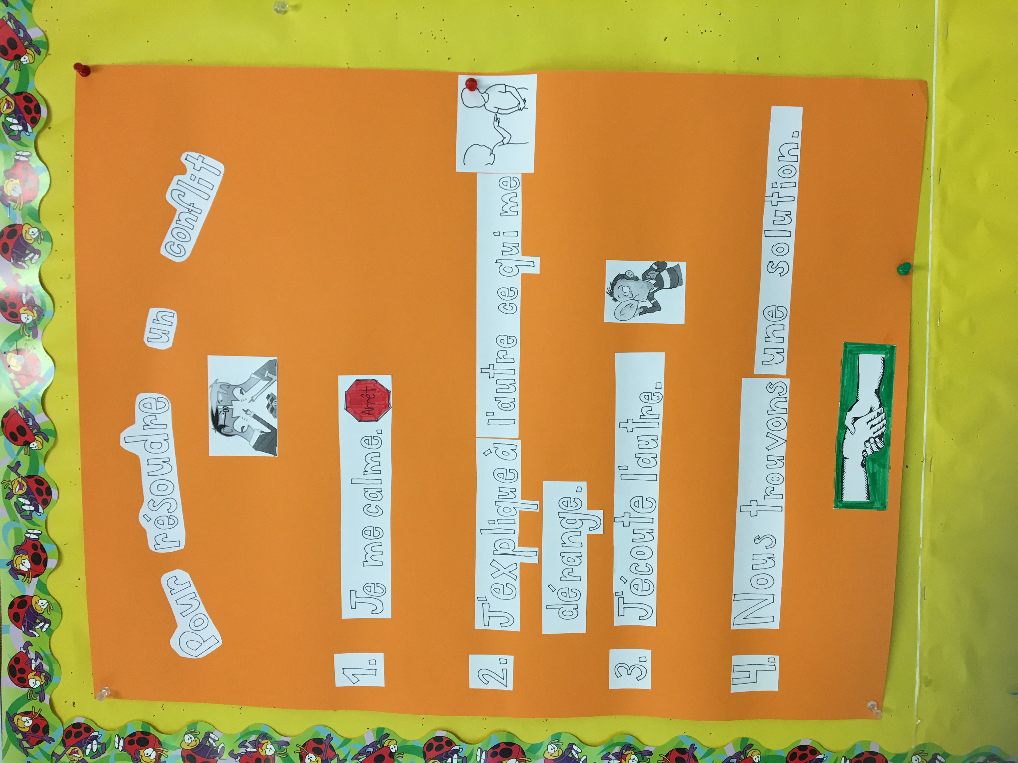 Présentation des différentes étapes de résolution de conflit (affiche). Chaque étape était présentée et expliquée aux élèves. Plusieurs modelages ont été faits par moi à l'avant à partir de différentes situations conflictuelles présentes en classe. Quelques modelages ont été faits avec l'aide de différents élèves volontaires.