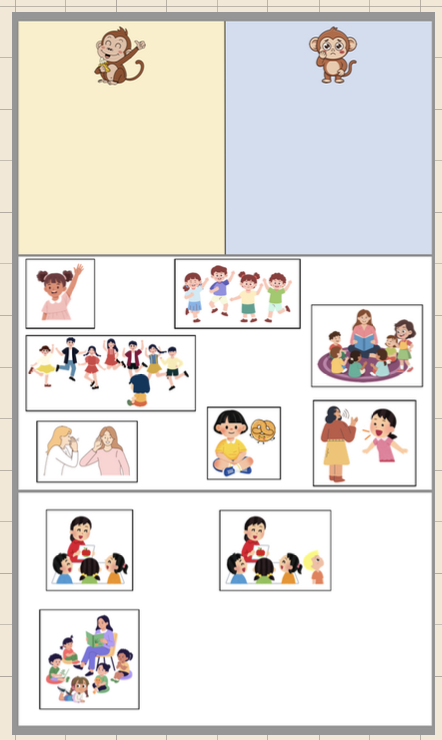 Les enfants avaient des grilles illustrées avec des pictogrammes représentant différentes actions. Ils ont déterminé d'eux-mêmes les catégories et devaient trouver l'endroit où placer le pictogramme. Ils ont pris beaucoup de plaisir à partager leurs idées, à essayer de repérer où devait aller l'image et à discuter entre eux.