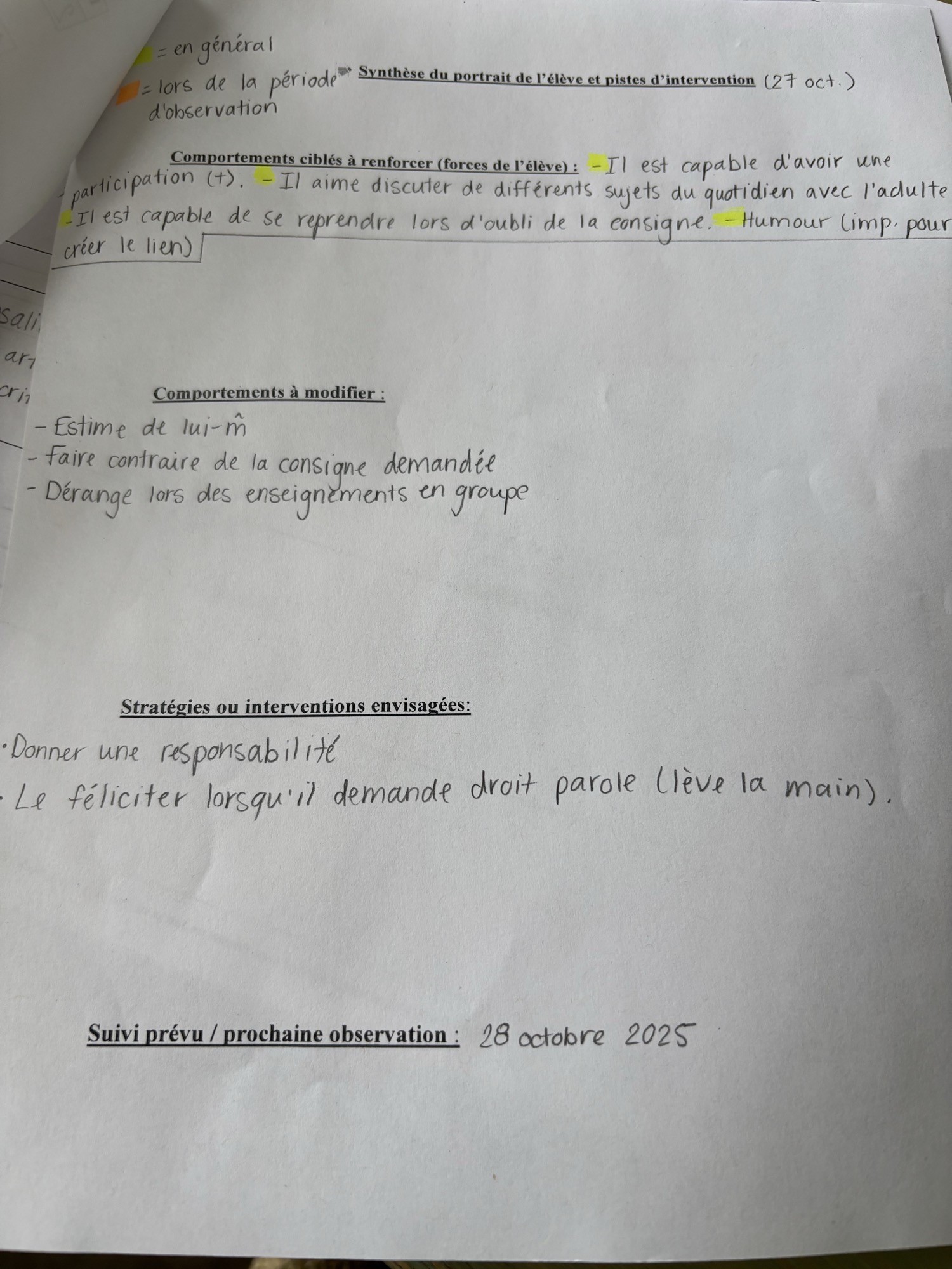 Avant de commencer mes interventions, j’ai dressé un bilan des forces et des défis de l’élève. Pour ce faire, j’avais également préparé une feuille de notes (voir pièce jointe). J’ai pris ces notes en présence de l’élève afin de souligner avec lui ses forces. Selon moi, cette étape était importante pour le valoriser et le motiver à améliorer son comportement en classe. De plus, j’avais établi une bonne relation de confiance avec lui. J’ai souvent dû avoir des discussions avec lui, car il vivait parfois des moments plus difficiles à la maison. Le simple fait d’en parler lui faisait du bien et m’aidait à comprendre certains de ses comportements.