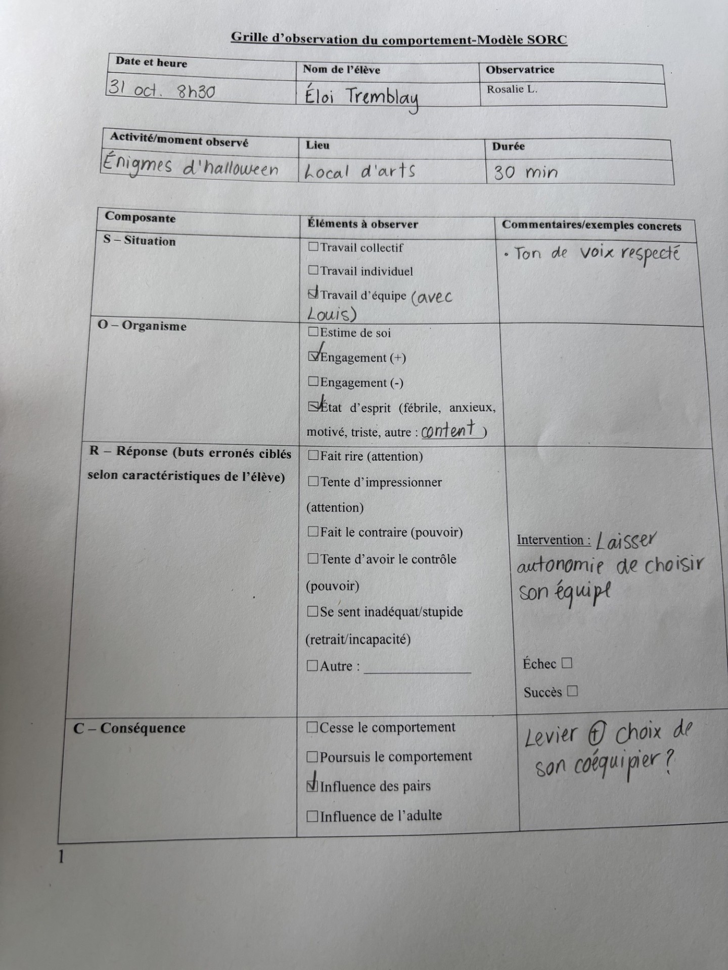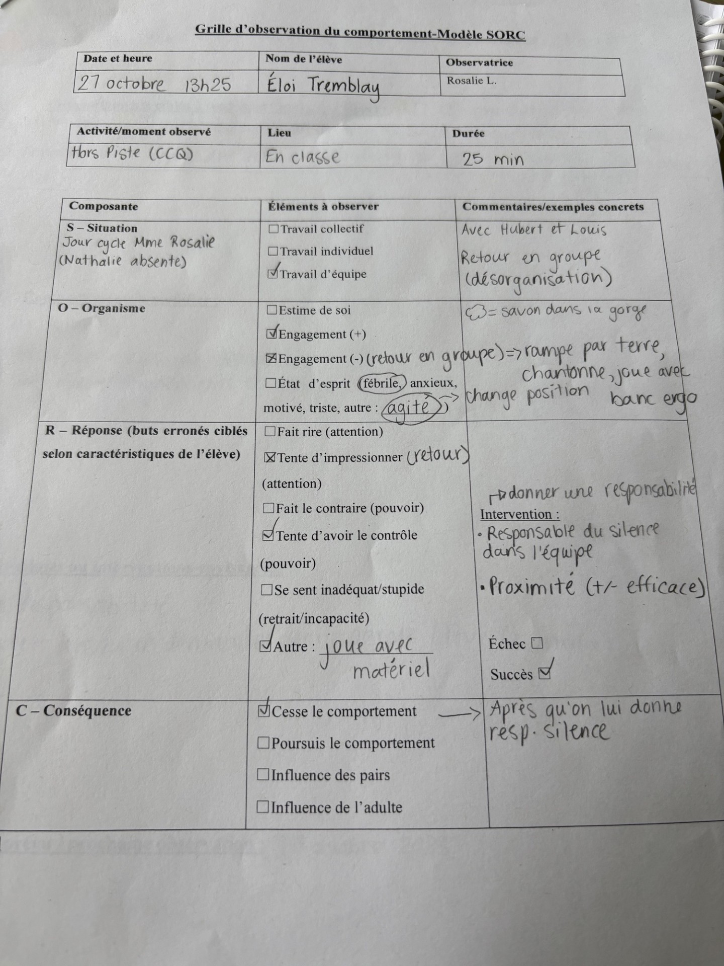 La première étape pour répondre au problème était d’effectuer une évaluation fonctionnelle du comportement de l’élève afin de bien comprendre la séquence comportementale. Pour ce faire, j’avais construit un outil sous forme de grille d’évaluation du comportement, basée sur le modèle SORC. Une colonne représentait la composante, une autre l’élément à observer — à cocher — et la dernière servait à ajouter des commentaires rapides. En haut du document, j’avais prévu un espace pour inscrire la date, le moment de la journée et le type d’activité. Cela me permettait de me concentrer sur un contexte de classe à la fois et d’observer l’élève dans différents types d’activités.