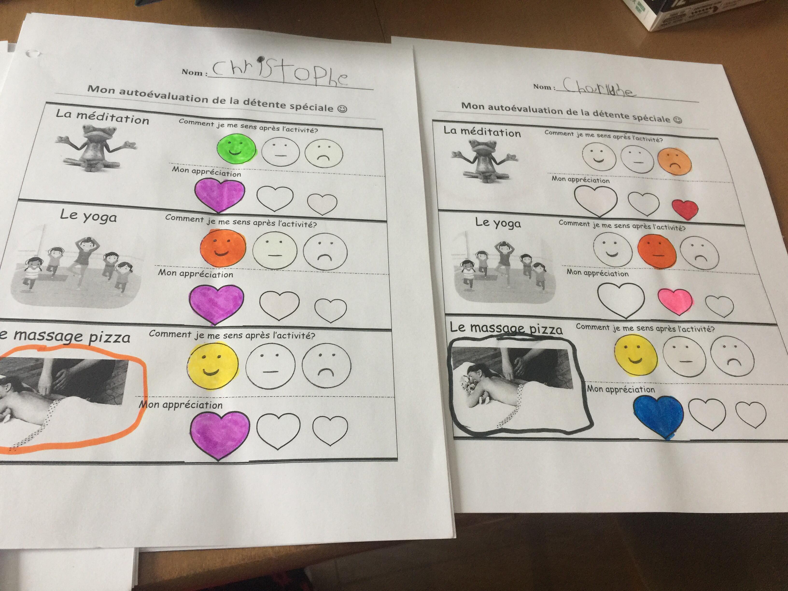 Sur une période de 8 semaines, la méditation et le yoga remplaçaient la période de détente en après-midi. C'est ce que l'on appelait «la détente spéciale». Lors de la première semaine, j'ai principalement fait de la méditation avec les élèves, afin qu'ils puissent y prendre goût. Par la suite, je faisais du yoga et de la méditation en alternance afin d'observer les impacts positifs ou négatifs chez les élèves. Après quelques semaines, nous avions intégré un autre aspect à la détente spéciale, soit «massage pizza». Par contre, cette technique de relaxation était toujours intégrée à la suite du yoga ou de la méditation. Il n'y avait donc pas d'observation à faire en lien avec le projet.