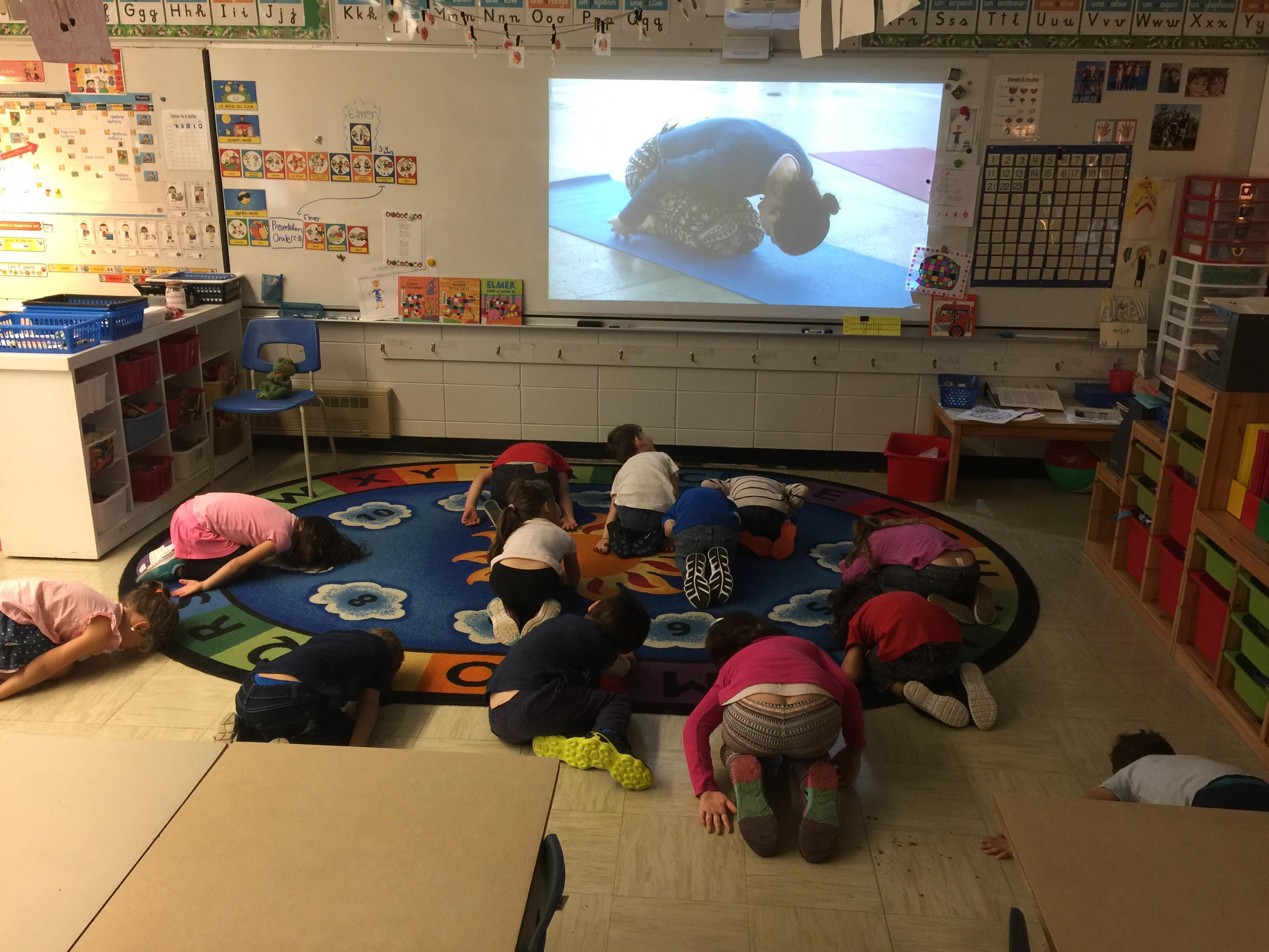 La période de yoga permettait de travailler plusieurs aspects importants pour le développement des élèves. En plus de développer de la souplesse, le yoga amenait les élèves à découvrir leur corps et à être en harmonie avec celui-ci. Cette période remplacait également la détente, et ce, plusieurs fois dans la semaine. Parfois, c’est moi qui modélisait les mouvements et étirements devant les élèves et d’autres fois je metTAIS des vidéos de yoga pour enfants.